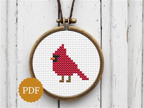 Tiny Red Cardinal Cross Stitch Pattern PDF, Mini Hoop Necklace Design, Wearable Embroidery Jewelry, Christmas Bird Ornament Easy Pattern