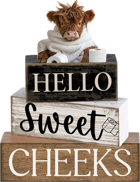 4 Pcs Easter Table Decorations Bunny Tiered Tray Decor Wooden Bunny Block Signs For Family Gatherings, Reusable Happy Easter Centerpiece For Kitchen, Home Shelf, Office Spring Party Tables(Bathroom Highland Cow)