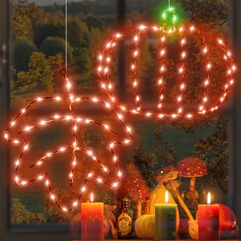 Fall Thanksgiving Window Decorations Lights, 2Pack Light Up Pumpkin And Maple Leaf, 8Mode Orange And Green Lights With Timer, Autumn Fall Farmhouse