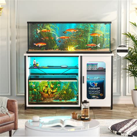 55-75 Gallon Fish Tank Stand With Charging Station And LED Light, Reversible Aquarium Stand With Cabinet - White