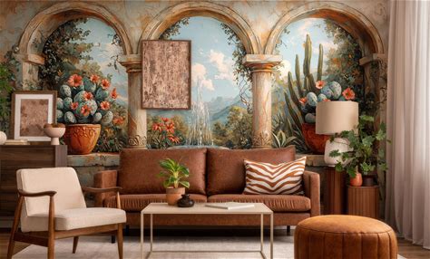 Mediterranean Landscape Wallpaper | Rustic Villa & Fountain Mural | Self-Adhesive Or Traditional | Scenic Wall Decor Renters Friendly