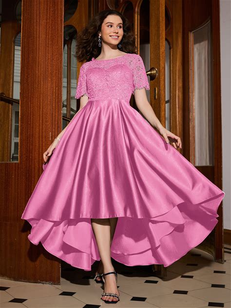 BABARONI BABARONI Satin Candy Pink Prom Dresses A-Line Jewel Short Lace Asymmetrical, Candy Pink / US0