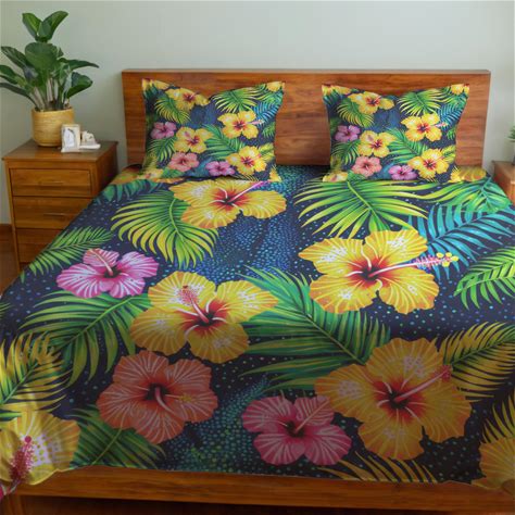 Colorful Tropical Flowers And Palm Leaves, Floral Bedding Set, Botanical Duvet Cover, Summer Bedroom Decor, Hawaiian Quilt, Comforter, Duvet