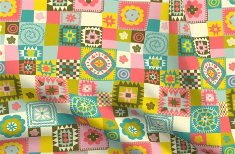 Recycled Canvas Fabric Fat Quarter - Patchwork Vintage Squares Knitting Colorful Quirky Custom Printed Fabric By Spoonflower