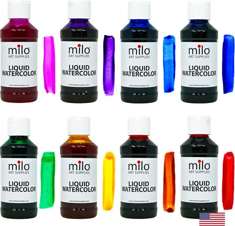Milo Liquid Watercolor Paint Set Of 8 Colors | 4 Oz Bottles | Washable, Safe And Non-Toxic | Made In USA | Arts & Crafts Paints For School Supplies