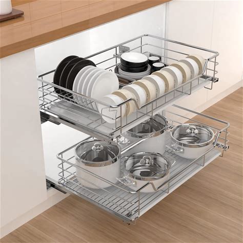Kitchen Cabinet 2 Tier Pull Out Drawer Nizer Heavy Duty Wire Basket Shelf With Drain Pan And Damping Guide Under Cabinet Storage Solution,69(W)41(D)13(H) Cm(49(W)41(D)13(H)Cm)