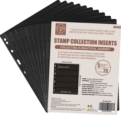 10 Sheets 20 Pages Postage Stamp Album Pages, 5 Pockets 7.7X 1.97in Stamp Collection Inserts, 9 Hole Standard Stamp Collecting Album Sleeves For Stamp