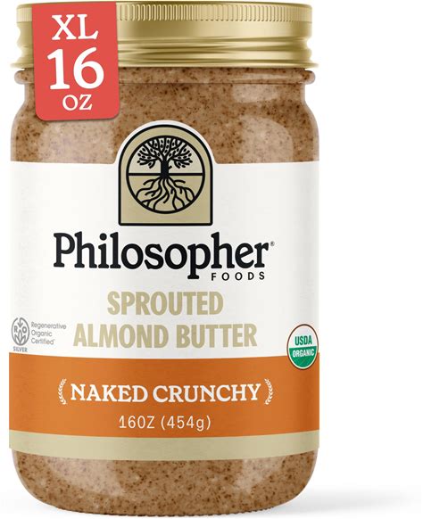 Philosopher Foods - Naked Crunchy Organic Sprouted Almond Butter - 16 Oz - Stone Ground Regenerative Organic Crunchy Almond Nut Butter No Sugar Added