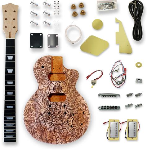 Bexgears DIY Electric Guitar Kits Engraved Surface Okoume Wood Body Curved Top With Mahogany Veneer Cover Maple Neck & Composite Ebony Fingerboard