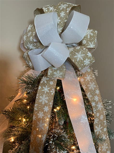 Largechristmas Tree Topper Bow Natural Burlap With White Shimmering Snowflakes And A White Glitter Ribbon