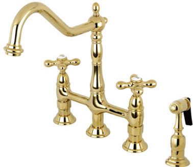 Kingston Brass Heritage Two-Handle 4-Hole Deck Mount Bridge Kitchen Faucet With Brass Side Sprayer Finish: Polished Brass