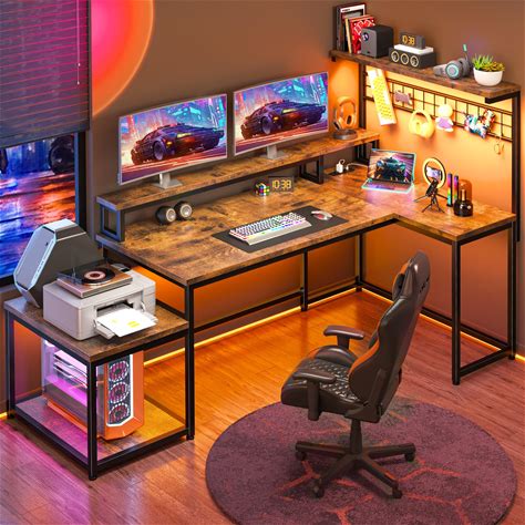 Enhomee 63" L Shaped Gaming Desk With LED Lights & Power Outlets,Reversible Corner Gaming Table With Storage Shelf & Hooks,Computer Desk With Monitor