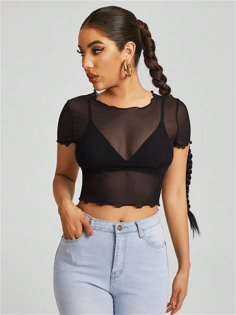 Lettuce Trim Sheer Mesh Crop Top Without Bra, Going Out Top,S