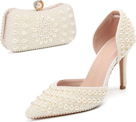 Women's White Pearl Stiletto Heels And Clutch Bag Set - Elegant Pointed Toe High Heel Shoes For Wedding, Bridal Parties, And Formal Events