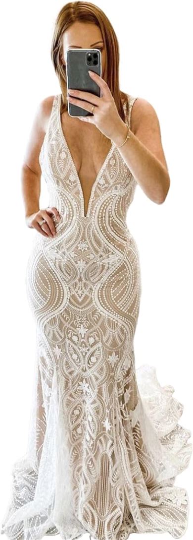 LIPOSA Plunge V Neck Boho Chic Lace Wedding Dress With Chapel Train & Nude Lining For Beach Weddings