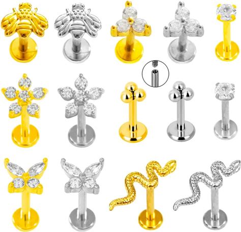 JUNLOWPY Heart Labret Stud Tragus Earring Set 16G CZ Crystal Surgical Steel Helix Cartilage Lip Ring