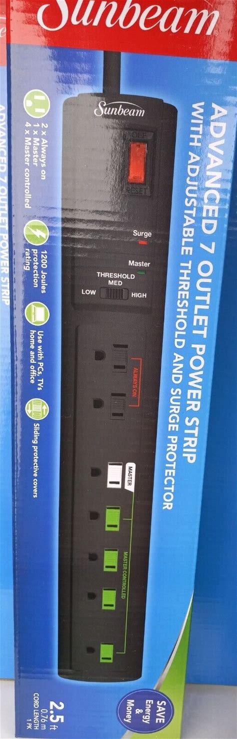 Sunbeam 7 Outlet Power Strip With Surge Protector 2X Always On 4X Master Control. Sunbeam. Black. Power Strips & Surge Protectors. 0629312163816.